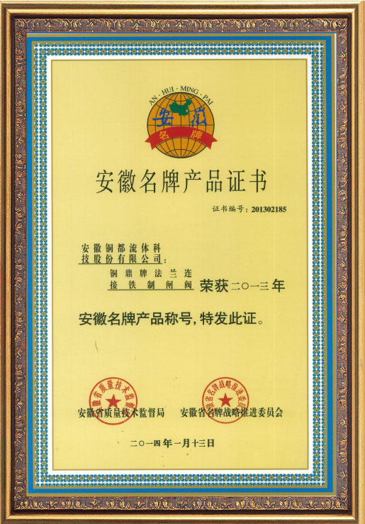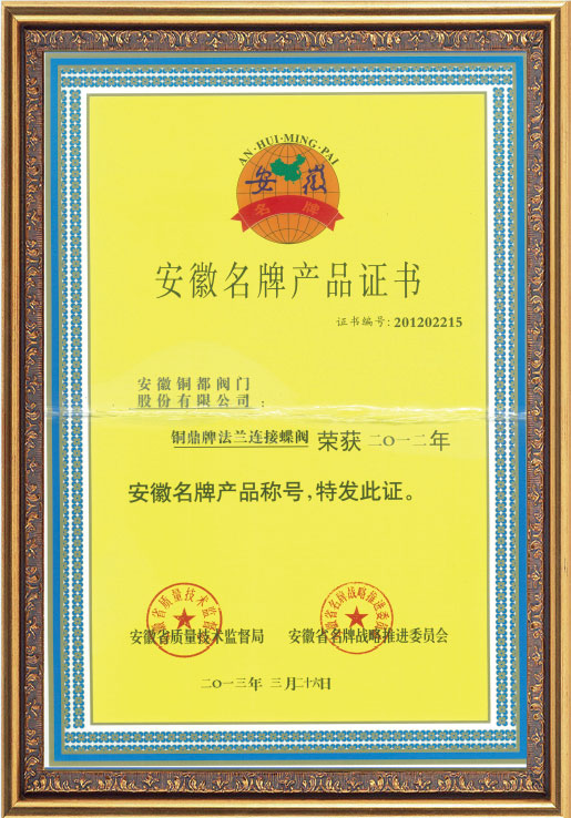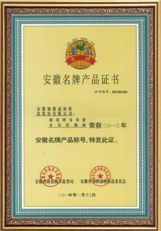 • 安徽名牌產(chǎn)品證書